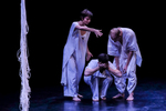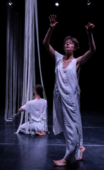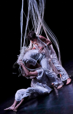 "Az átlépésközeli helyzeteket általában kíváncsisággal vegyes borzongással éljük meg, sokszor olyan talajvesztett, összezavarodott állapotba kerülve, mint a spagettifüggönybe belegabalyodó előadók. A színpadkép (Csasznyi Dénes munkája) a maga megkapó egyszerűségében is különleges lehetőségeket rejtett, hol foglyul ejtette, hol anyaméhhez hasonló biztonságba ringatta a táncosokat. A hosszú szálakból álló függönyökkel három részre osztott színpad – akár a szentháromság – nem tagolta a teret, inkább annak egységét teremtette meg.